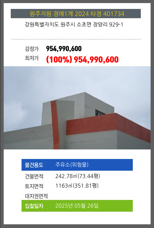 사건번호 2024 타경 401734 본건은 강원특별자치도 원주시 소초면 장양리 929-1소재하는 주유소(위험물)경매 물건의 포스팅입니다. 건물면적 [ 242.78㎡ (73.44평) ]토지면적 [ 1163㎡ (351.81평) ] 시세를 반영한 감정가