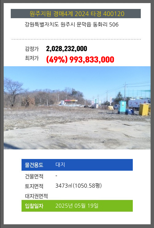 사건번호 2024 타경 400120 본건은 강원특별자치도 원주시 문막읍 동화리 506소재하는 대지경매 물건의 포스팅입니다. 토지면적 [ 3473㎡ (1050.58평) ] 시세를 반영한 감정가 2,028,232,000에서2회 유찰되어 감정가 대비