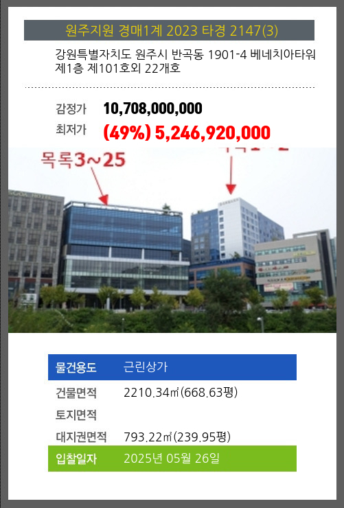 사건번호 2023 타경 2147(3) 본건은 강원특별자치도 원주시 반곡동 1901-4 베네치아타워 제1층 제101호외 22개호소재하는 근린상가경매 물건의 포스팅입니다. 건물면적 [ 2210.34㎡ (668.63평) ]대지권 [ 793.22㎡ (239.95평) ]