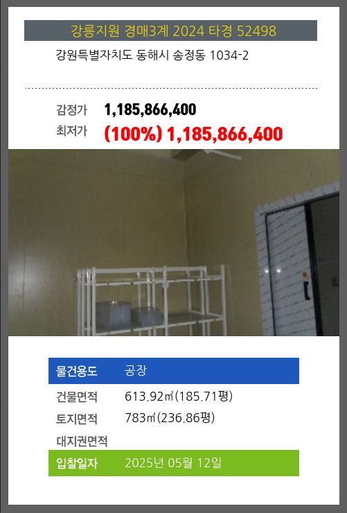 사건번호 2024 타경 52498 본건은 강원특별자치도 동해시 송정동 1034-2소재하는 공장경매 물건의 포스팅입니다. 건물면적 [ 613.92㎡ (185.71평) ]토지면적 [ 783㎡ (236.86평) ] 시세를 반영한 감정가 1,185,866,400에서신건으로