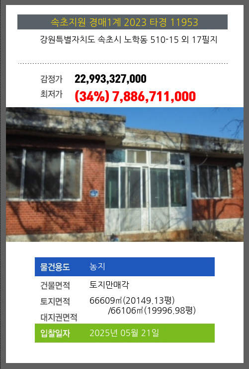 사건번호 2023 타경 11953 본건은 강원특별자치도 속초시 노학동 510-15 외 17필지소재하는 농지경매 물건의 포스팅입니다. 건물면적 [ 토지만매각 ]토지면적 [ 전체:66609㎡ (20149.13평) 매각지분:66106㎡ (19996.98평) ] 시세를