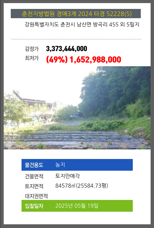 사건번호 2024 타경 52228(5) 본건은 강원특별자치도 춘천시 남산면 방곡리 455 외 5필지소재하는 농지경매 물건의 포스팅입니다. 건물면적 [ 토지만매각 ]토지면적 [ 84578㎡ (25584.73평) ] 시세를 반영한