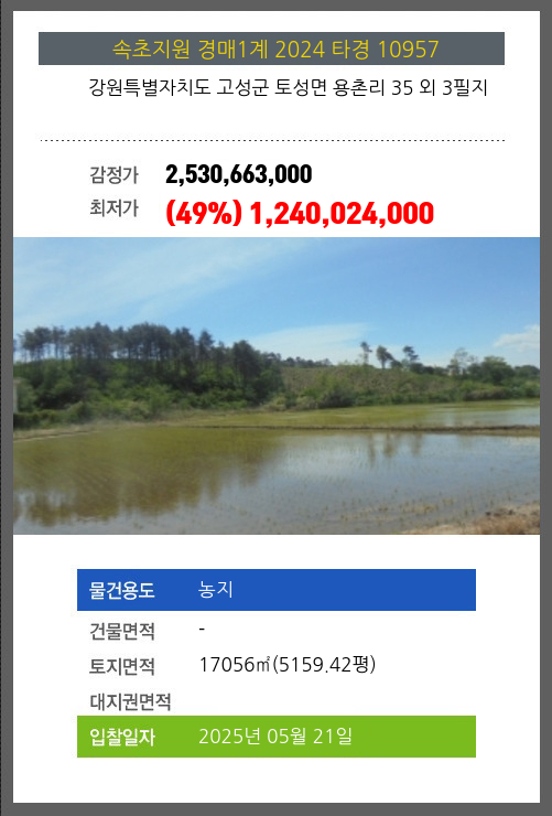 사건번호 2024 타경 10957 본건은 강원특별자치도 고성군 토성면 용촌리 35 외 3필지소재하는 농지경매 물건의 포스팅입니다. 토지면적 [ 17056㎡ (5159.42평) ] 시세를 반영한 감정가 2,530,663,000에서2회 유찰되어