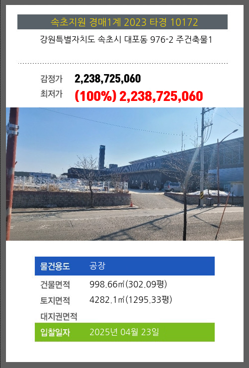 사건번호 2023 타경 10172 본건은 강원특별자치도 속초시 대포동 976-2 주건축물1소재하는 공장경매 물건의 포스팅입니다. 건물면적 [ 998.66㎡ (302.09평) ]토지면적 [ 4282.1㎡ (1295.33평) ] 시세를 반영한 감정가