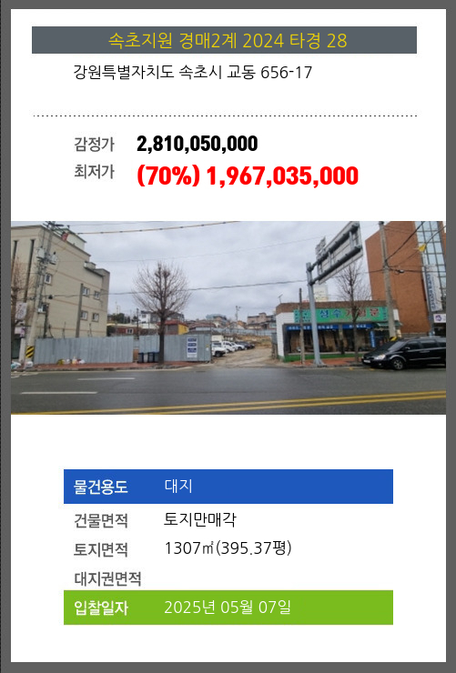 사건번호 2024 타경 28 본건은 강원특별자치도 속초시 교동 656-17소재하는 대지경매 물건의 포스팅입니다. 건물면적 [ 토지만매각 ]토지면적 [ 1307㎡ (395.37평) ] 시세를 반영한 감정가 2,810,050,000에서2회 유찰되어