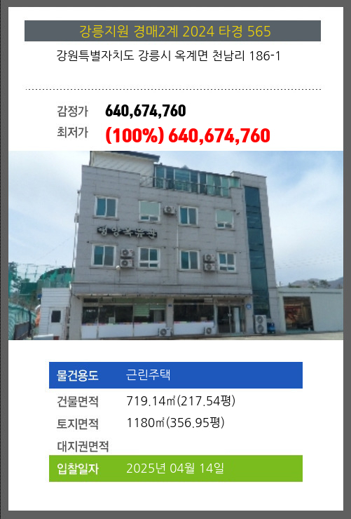 사건번호 2024 타경 565 본건은 강원특별자치도 강릉시 옥계면 천남리 186-1소재하는 근린주택경매 물건의 포스팅입니다. 건물면적 [ 719.14㎡ (217.54평) ]토지면적 [ 1180㎡ (356.95평) ] 시세를 반영한 감정가