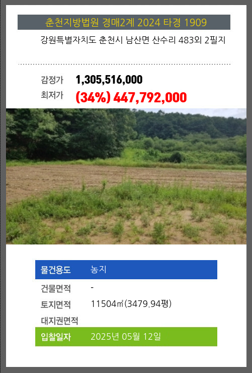 사건번호 2024 타경 1909 본건은 강원특별자치도 춘천시 남산면 산수리 483외 2필지소재하는 농지경매 물건의 포스팅입니다. 토지면적 [ 11504㎡ (3479.94평) ] 시세를 반영한 감정가 1,305,516,000에서3회 유찰되어 감정가