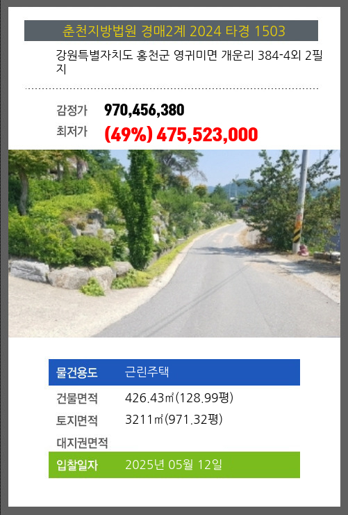 사건번호 2024 타경 1503 본건은 강원특별자치도 홍천군 영귀미면 개운리 384-4외 2필지소재하는 근린주택경매 물건의 포스팅입니다. 건물면적 [ 426.43㎡ (128.99평) ]토지면적 [ 3211㎡ (971.32평) ] 시세를 반영한