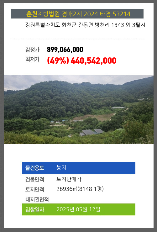 사건번호 2024 타경 53214 본건은 강원특별자치도 화천군 간동면 방천리 1343 외 3필지소재하는 농지경매 물건의 포스팅입니다. 건물면적 [ 토지만매각 ]토지면적 [ 26936㎡ (8148.1평) ] 시세를 반영한