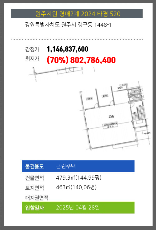 사건번호 2024 타경 520 본건은 강원특별자치도 원주시 행구동 1448-1소재하는 근린주택경매 물건의 포스팅입니다. 건물면적 [ 479.3㎡ (144.99평) ]토지면적 [ 463㎡ (140.06평) ] 시세를 반영한 감정가 1,146,837,600에서1회