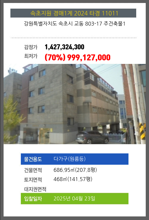 사건번호 2024 타경 11011 본건은 강원특별자치도 속초시 교동 803-17 주건축물1소재하는 다가구(원룸등)경매 물건의 포스팅입니다. 건물면적 [ 686.95㎡ (207.8평) ]토지면적 [ 468㎡ (141.57평) ] 시세를 반영한 감정가