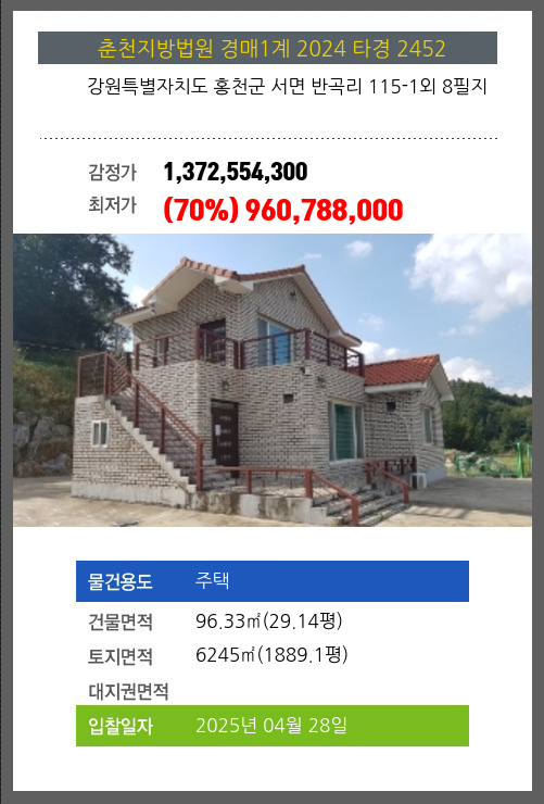 사건번호 2024 타경 2452 본건은 강원특별자치도 홍천군 서면 반곡리 115-1외 8필지소재하는 주택경매 물건의 포스팅입니다. 건물면적 [ 96.33㎡ (29.14평) ]토지면적 [ 6245㎡ (1889.1평) ] 시세를 반영한