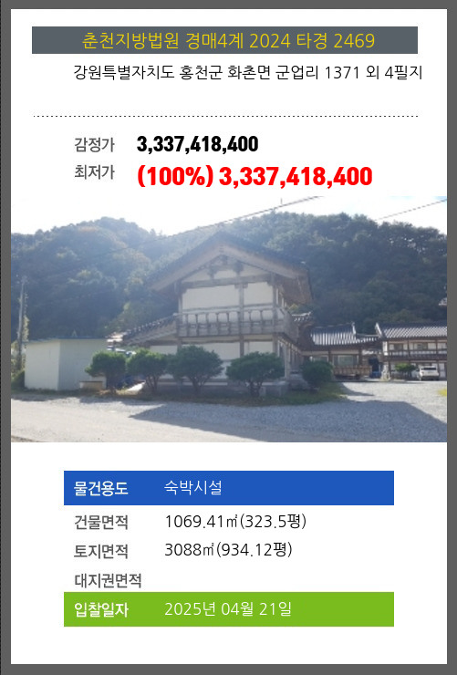 사건번호 2024 타경 2469 본건은 강원특별자치도 홍천군 화촌면 군업리 1371 외 4필지소재하는 숙박시설경매 물건의 포스팅입니다. 건물면적 [ 1069.41㎡ (323.5평) ]토지면적 [ 3088㎡ (934.12평) ] 시세를
