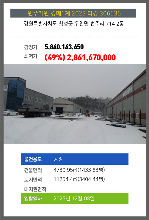 사건번호 2023 타경 306535 본건은 강원특별자치도 횡성군 우천면 법주리 714 2동소재하는 공장경매 물건의 포스팅입니다. 건물면적 [ 4739.95㎡ (1433.83평) ]토지면적 [ 11254.4㎡ (3404.44평) ] 시세를 반영한