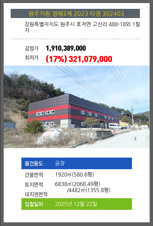 사건번호 2023 타경 302403 본건은 강원특별자치도 원주시 호저면 고산리 488-18외 1필지소재하는 공장경매 물건의 포스팅입니다. 건물면적 [ 1920㎡ (580.8평) ]토지면적 [ 전체:6838㎡ (2068.49평) 매각지분:4482㎡ (1355.8평) ]