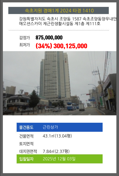 사건번호 2024 타경 1410 본건은 강원특별자치도 속초시 조양동 1587 속초조양동양우내안애오션스카이 제근린생활시설동 제1층 제111호소재하는 근린상가경매 물건의 포스팅입니다. 건물면적 [ 43.1㎡ (13.04평) ]대지권 [ 7.84㎡ (2.37평) ]