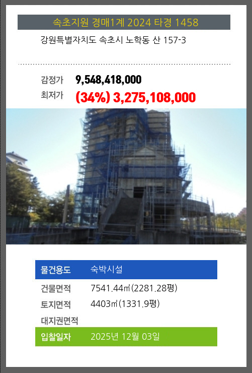 사건번호 2024 타경 1458 본건은 강원특별자치도 속초시 노학동 산 157-3소재하는 숙박시설경매 물건의 포스팅입니다. 건물면적 [ 7541.44㎡ (2281.28평) ]토지면적 [ 4403㎡ (1331.9평) ] 시세를 반영한 감정가
