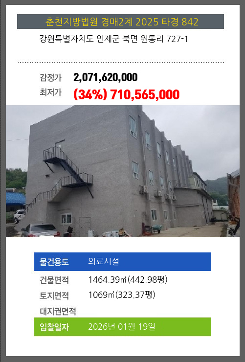 사건번호 2025 타경 842 본건은 강원특별자치도 인제군 북면 원통리 727-1소재하는 의료시설경매 물건의 포스팅입니다. 건물면적 [ 1464.39㎡ (442.98평) ]토지면적 [ 1069㎡ (323.37평) ] 시세를 반영한 감정가