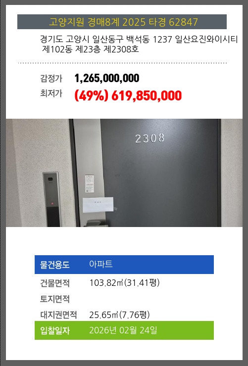사건번호 2025 타경 62847 본건은 경기도 고양시 일산동구 백석동 1237 일산요진와이시티 제102동 제23층 제2308호소재하는 아파트경매 물건의 포스팅입니다. 건물면적 [ 103.82㎡ (31.41평) ]대지권 [ 25.65㎡ (7.76평)