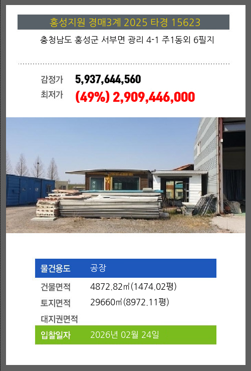사건번호 2025 타경 15623 본건은 충청남도 홍성군 서부면 광리 4-1 주1동외 6필지소재하는 공장경매 물건의 포스팅입니다. 건물면적 [ 4872.82㎡ (1474.02평) ]토지면적 [ 29660㎡ (8972.11평) ] 시세를