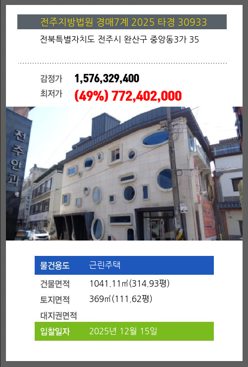 사건번호 2025 타경 30933 본건은 전북특별자치도 전주시 완산구 중앙동3가 35소재하는 근린주택경매 물건의 포스팅입니다. 건물면적 [ 1041.11㎡ (314.93평) ]토지면적 [ 369㎡ (111.62평) ] 시세를 반영한 감정가