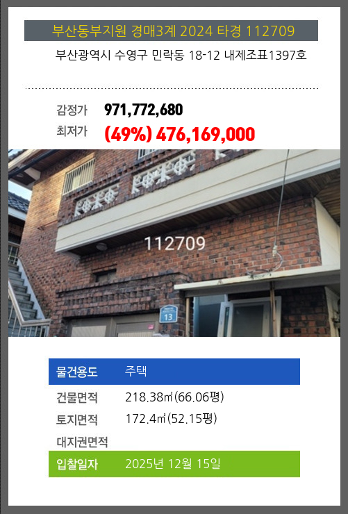 사건번호 2024 타경 112709 본건은 부산광역시 수영구 민락동 18-12 내제조표1397호소재하는 주택경매 물건의 포스팅입니다. 건물면적 [ 218.38㎡ (66.06평) ]토지면적 [ 172.4㎡ (52.15평) ] 시세를 반영한 감정가