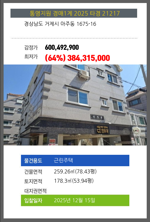 사건번호 2025 타경 21217 본건은 경상남도 거제시 아주동 1675-16소재하는 근린주택경매 물건의 포스팅입니다. 건물면적 [ 259.26㎡ (78.43평) ]토지면적 [ 178.3㎡ (53.94평) ] 시세를 반영한 감정가 600,492,900에서2회