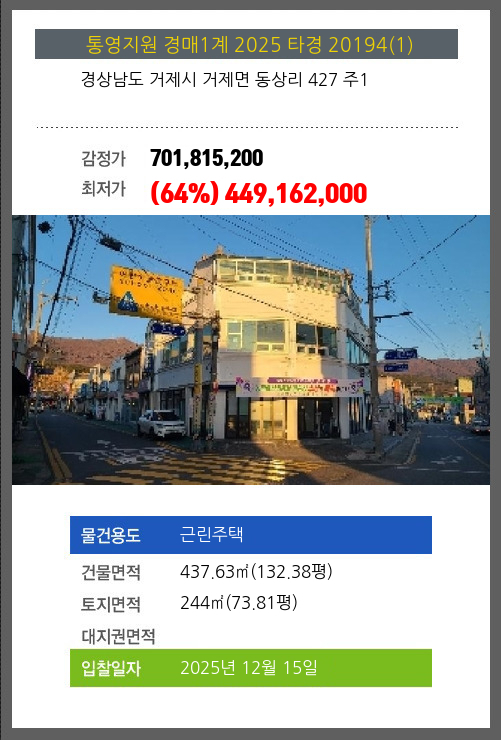 사건번호 2025 타경 20194(1) 본건은 경상남도 거제시 거제면 동상리 427 주1소재하는 근린주택경매 물건의 포스팅입니다. 건물면적 [ 437.63㎡ (132.38평) ]토지면적 [ 244㎡ (73.81평) ] 시세를 반영한
