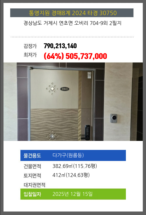 사건번호 2024 타경 30750 본건은 경상남도 거제시 연초면 오비리 704-9외 2필지소재하는 다가구(원룸등)경매 물건의 포스팅입니다. 건물면적 [ 382.69㎡ (115.76평) ]토지면적 [ 412㎡ (124.63평) ] 시세를 반영한