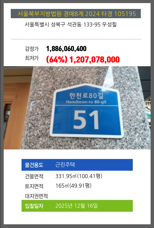 사건번호 2024 타경 105195 본건은 서울특별시 성북구 석관동 133-95 우성힐소재하는 근린주택경매 물건의 포스팅입니다. 건물면적 [ 331.95㎡ (100.41평) ]토지면적 [ 165㎡ (49.91평) ] 시세를 반영한 감정가