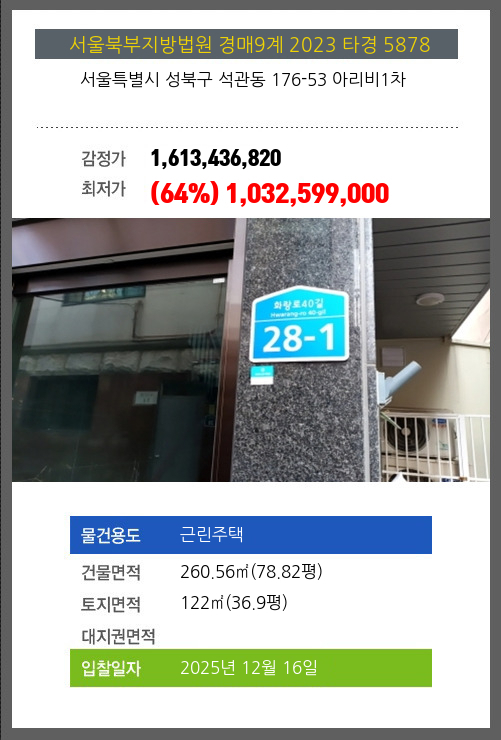 사건번호 2023 타경 5878 본건은 서울특별시 성북구 석관동 176-53 아리비1차소재하는 근린주택경매 물건의 포스팅입니다. 건물면적 [ 260.56㎡ (78.82평) ]토지면적 [ 122㎡ (36.9평) ] 시세를 반영한 감정가
