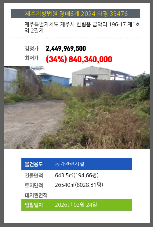 사건번호 2024 타경 33476 본건은 제주특별자치도 제주시 한림읍 금악리 196-17 제1호외 2필지소재하는 농가관련시설경매 물건의 포스팅입니다. 건물면적 [ 643.5㎡ (194.66평) ]토지면적 [ 26540㎡ (8028.31평) ] 시세를