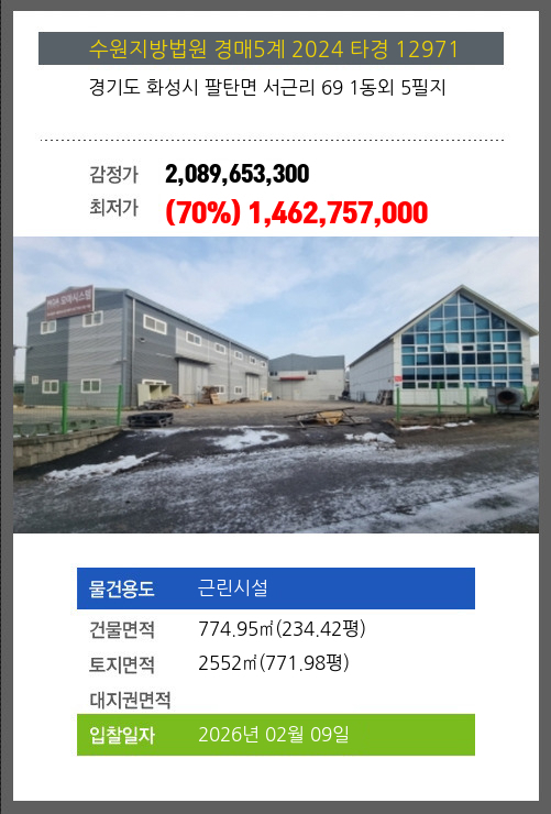 사건번호 2024 타경 12971 본건은 경기도 화성시 팔탄면 서근리 69 1동외 5필지소재하는 근린시설경매 물건의 포스팅입니다. 건물면적 [ 774.95㎡ (234.42평) ]토지면적 [ 2552㎡ (771.98평) ] 시세를