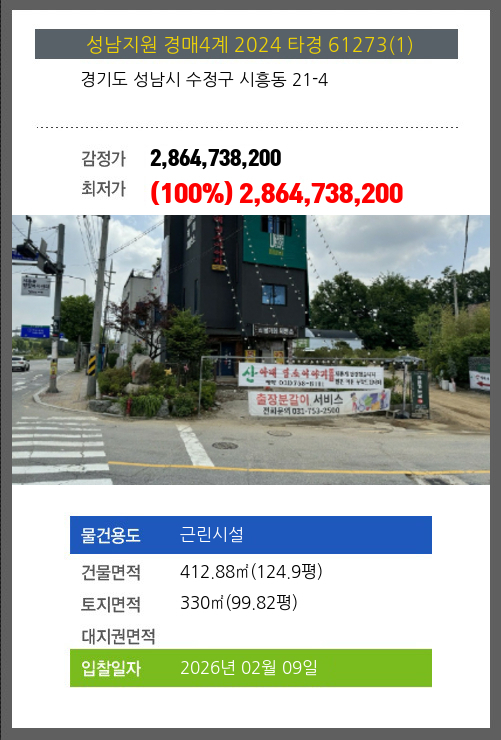 사건번호 2024 타경 61273(1) 본건은 경기도 성남시 수정구 시흥동 21-4소재하는 근린시설경매 물건의 포스팅입니다. 건물면적 [ 412.88㎡ (124.9평) ]토지면적 [ 330㎡ (99.82평) ] 시세를 반영한 감정가