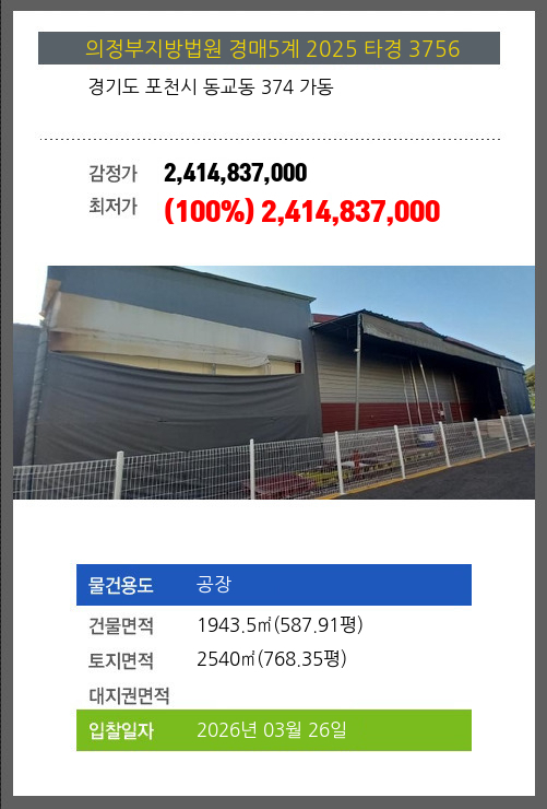 사건번호 2025 타경 3756 본건은 경기도 포천시 동교동 374 가동소재하는 공장경매 물건의 포스팅입니다. 건물면적 [ 1943.5㎡ (587.91평) ]토지면적 [ 2540㎡ (768.35평) ] 시세를 반영한 감정가
