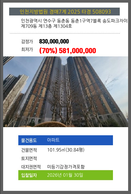 사건번호 2025 타경 508093 본건은 인천광역시 연수구 동춘동 동춘1구역7블록 송도파크자이 제709동 제13층 제1304호소재하는 아파트경매 물건의 포스팅입니다. 건물면적 [ 101.95㎡ (30.84평) ]대지권 [ 미등기감정가격포함 ] 시세를