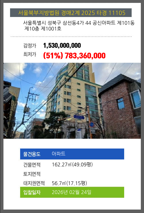 사건번호 2025 타경 11105 본건은 서울특별시 성북구 삼선동4가 44 공신아파트 제101동 제10층 제1001호소재하는 아파트경매 물건의 포스팅입니다. 건물면적 [ 162.27㎡ (49.09평) ]대지권 [ 56.7㎡ (17.15평) ]