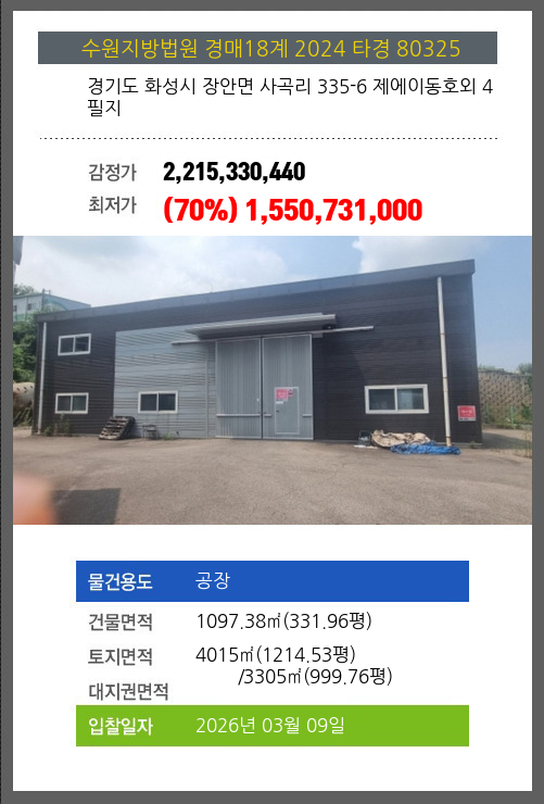 사건번호 2024 타경 80325 본건은 경기도 화성시 장안면 사곡리 335-6 제에이동호외 4필지소재하는 공장경매 물건의 포스팅입니다. 건물면적 [ 1097.38㎡ (331.96평) ]토지면적 [ 전체:4015㎡ (1214.53평) 매각지분:3305㎡ (999.76평)
