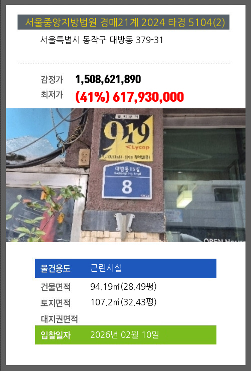 사건번호 2024 타경 5104(2) 본건은 서울특별시 동작구 대방동 379-31소재하는 근린시설경매 물건의 포스팅입니다. 건물면적 [ 94.19㎡ (28.49평) ]토지면적 [ 107.2㎡ (32.43평) ] 시세를 반영한 감정가 1,508,621,890에서2회