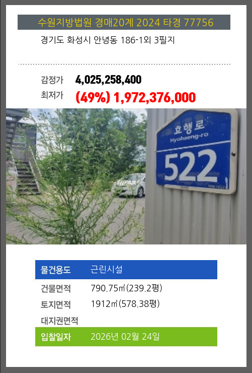 사건번호 2024 타경 77756 본건은 경기도 화성시 안녕동 186-1외 3필지소재하는 근린시설경매 물건의 포스팅입니다. 건물면적 [ 790.75㎡ (239.2평) ]토지면적 [ 1912㎡ (578.38평) ] 시세를 반영한 감정가