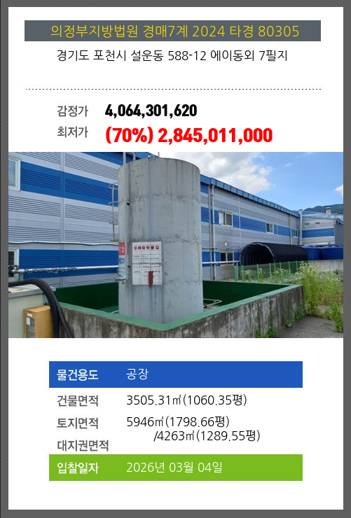 사건번호 2024 타경 80305 본건은 경기도 포천시 설운동 588-12 에이동외 7필지소재하는 공장경매 물건의 포스팅입니다. 건물면적 [ 3505.31㎡ (1060.35평) ]토지면적 [ 전체:5946㎡ (1798.66평) 매각지분:4263㎡ (1289.55평) ]
