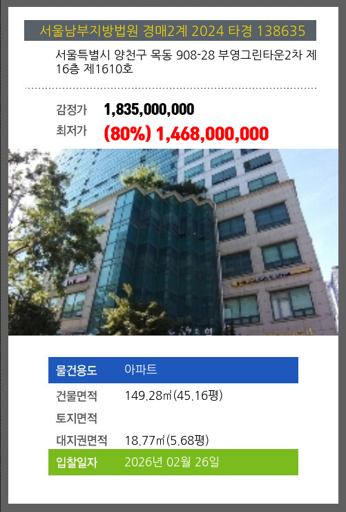 사건번호 2024 타경 138635 본건은 서울특별시 양천구 목동 908-28 부영그린타운2차 제16층 제1610호소재하는 아파트경매 물건의 포스팅입니다. 건물면적 [ 149.28㎡ (45.16평) ]대지권 [ 18.77㎡ (5.68평) ] 시세를