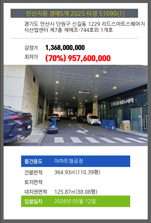 사건번호 2025 타경 51090(1) 본건은 경기도 안산시 단원구 신길동 1229 리드스마트스퀘어지식산업센터 제7층 제에프-744호외 1개호소재하는 아파트형공장경매 물건의 포스팅입니다. 건물면적 [ 364.93㎡ (110.39평) ]대지권 [ 125.87㎡ (38.08평)