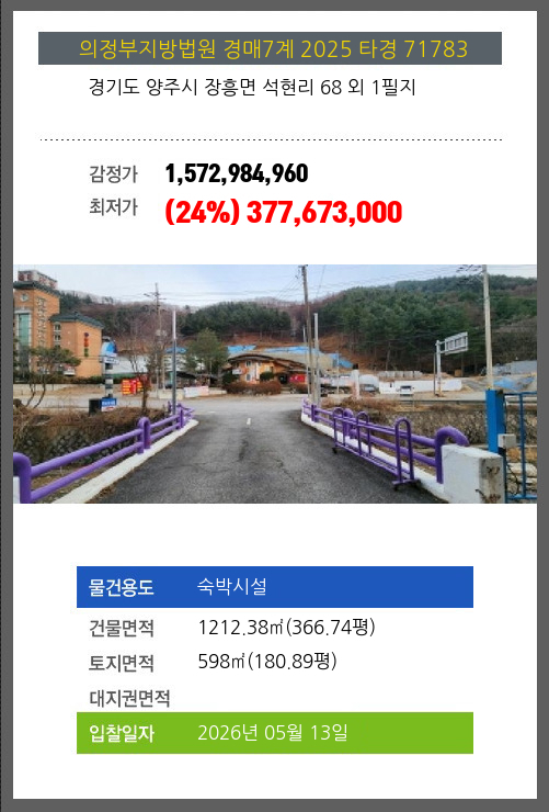 사건번호 2025 타경 71783 본건은 경기도 양주시 장흥면 석현리 68 외 1필지소재하는 숙박시설경매 물건의 포스팅입니다. 건물면적 [ 1212.38㎡ (366.74평) ]토지면적 [ 598㎡ (180.89평) ] 시세를