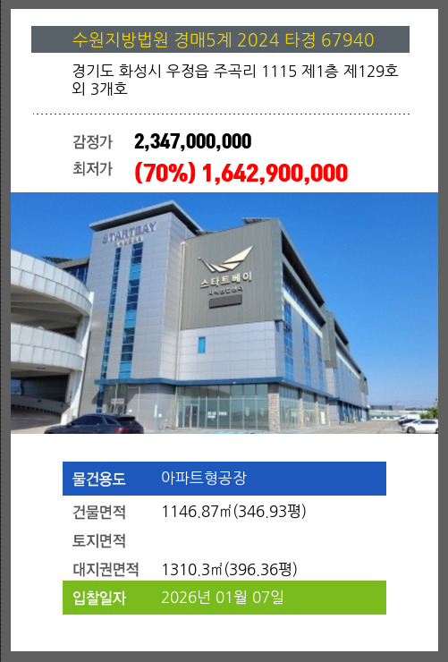 사건번호 2024 타경 67940 본건은 경기도 화성시 우정읍 주곡리 1115 제1층 제129호외 3개호소재하는 아파트형공장경매 물건의 포스팅입니다. 건물면적 [ 1146.87㎡ (346.93평) ]대지권 [ 1310.3㎡ (396.36평) ]
