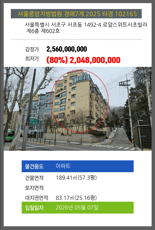 사건번호 2025 타경 102165 본건은 서울특별시 서초구 서초동 1492-4 로얄스위트서초빌라 제6층 제602호소재하는 아파트경매 물건의 포스팅입니다. 건물면적 [ 189.41㎡ (57.3평) ]대지권 [ 83.17㎡ (25.16평) ] 시세를