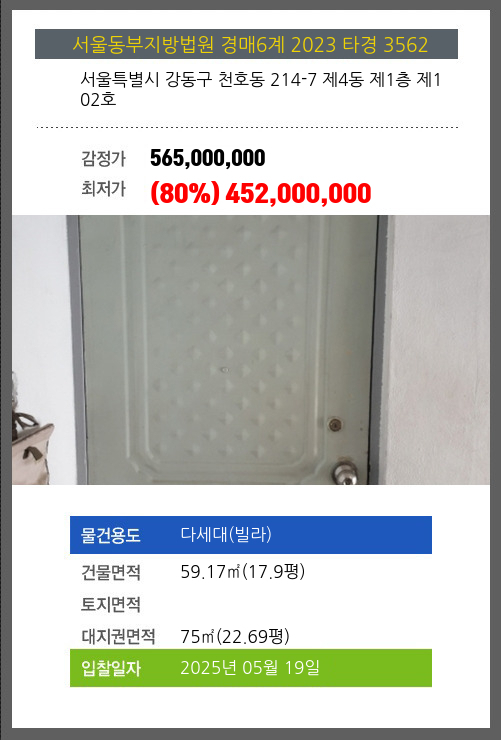 사건번호 2023 타경 3562 본건은 서울특별시 강동구 천호동 214-7 제4동 제1층 제102호소재하는 다세대(빌라)경매 물건의 포스팅입니다. 건물면적 [ 59.17㎡ (17.9평) ]대지권 [ 75㎡ (22.69평) ] 시세를