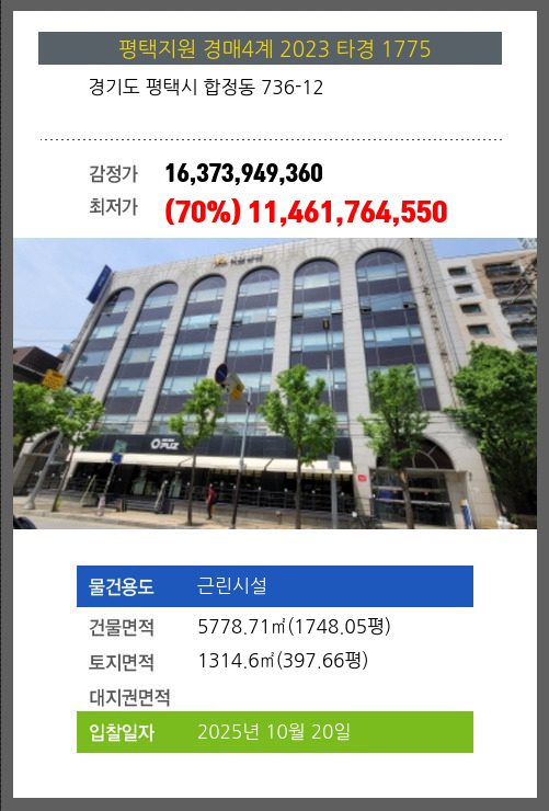 사건번호 2023 타경 1775 본건은 경기도 평택시 합정동 736-12소재하는 근린시설경매 물건의 포스팅입니다. 건물면적 [ 5778.71㎡ (1748.05평) ]토지면적 [ 1314.6㎡ (397.66평) ] 시세를 반영한 감정가 16,373,949,360에서1회