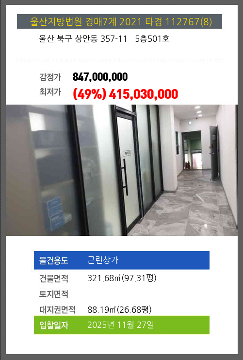 사건번호 2021 타경 112767(8) 본건은 울산 북구 상안동 357-11 5층501호소재하는 근린상가경매 물건의 포스팅입니다. 건물면적 [ 321.68㎡ (97.31평) ]대지권 [ 88.19㎡ (26.68평) ] 시세를 반영한 감정가