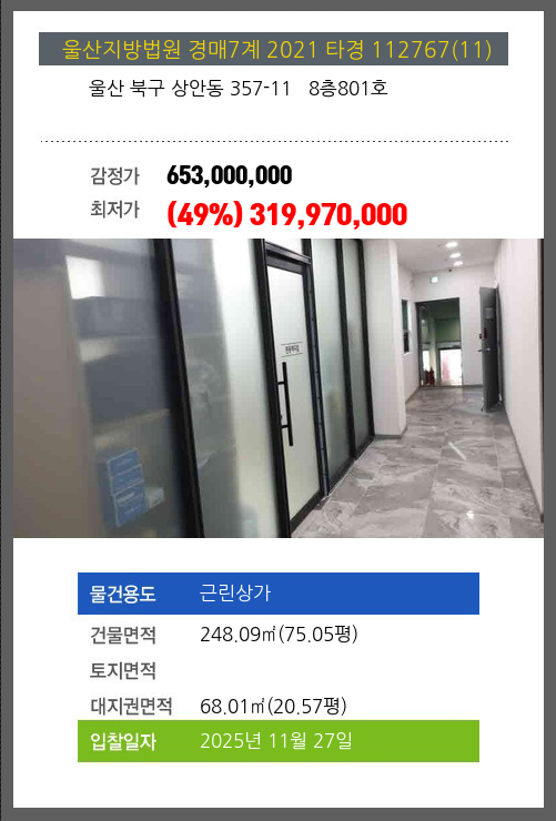 사건번호 2021 타경 112767(11) 본건은 울산 북구 상안동 357-11 8층801호소재하는 근린상가경매 물건의 포스팅입니다. 건물면적 [ 248.09㎡ (75.05평) ]대지권 [ 68.01㎡ (20.57평) ] 시세를 반영한 감정가